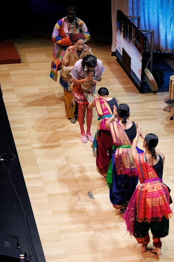 Accompanying the retail collection runway on stage was a Bharatanatyam dance choreographed by Piyali and danced by Kahini dancers (Abi, Gaya and Piyali) which expressed the stories of the migrant women who donated the saris as well as the creatives who transformed them.